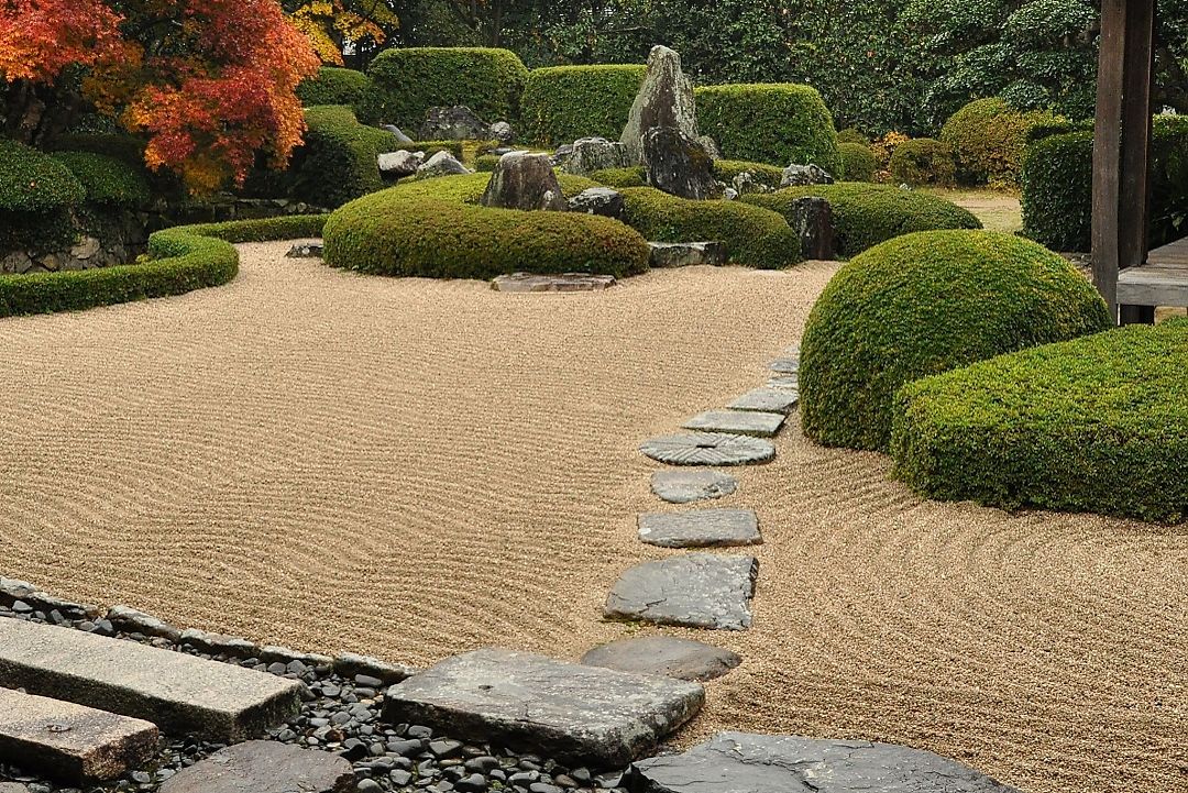 Kamenné kompozice v zahradě představují ostrovy jeřába a želvy. Celková kompozice zahrady je podobná té v chrámu Konči-in, kterou navrhoval také K. Enšú a je zachována v původní podobě