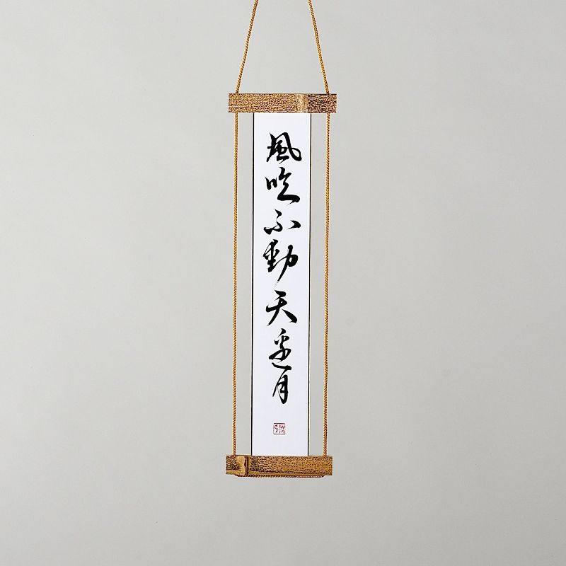 Jedná se o zenové přísloví, napsané v kombinací stylů gjóšo (kurzivní písmo) a sóšo (trávové písmo)